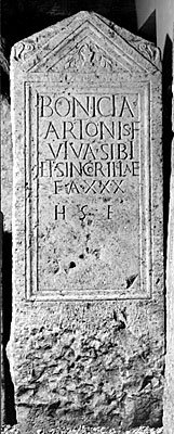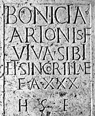 - Bonicia / Artonis f(ilia) / viva sibi / et Sincorillae / f(iliae) a(nnorum) XXX / h(ic) s(ita) e(st)