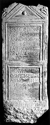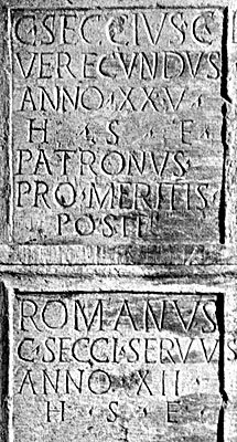 - C(aius) Seccius C(ai) l(ibertus) / Verecundus / ann(orum) XXV / h(ic) s(itus) e(st) / patronus / pro meritis / pos(u)it // Romanus / C(ai) Secci servus / anno(rum) XII / h(ic) s(itus) e(st)
