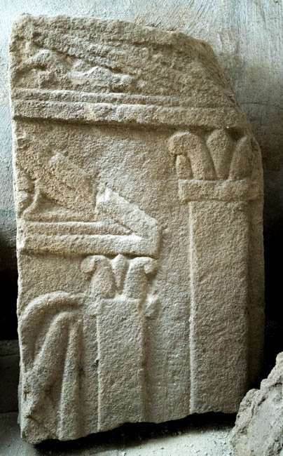 Im Hauptbild zwischen Pilastern mit Blattkapitell Aediculafront mit Giebel auf Pilaster mit Blattkapitell. Im Giebelfeld Gorgoneion (?), in der Aedicula ungedeutetes Objekt.