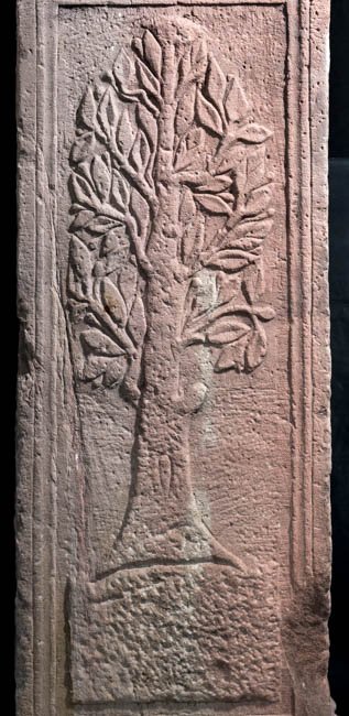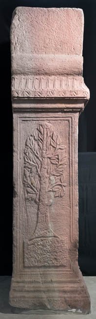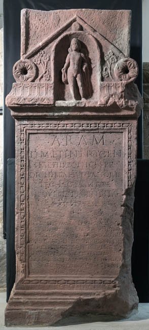 - Kubischer Aufsatz über Volutenpolster (pulvini) mit Rosetten, zwischen diesen unten offenes Giebelfeld, in das eine Bogennische eingetieft ist, die auch das Kyma des Altars überschneidet. In der Nische stehender Erot (Genius), seitlich je ein Blütenstängel. Altarschaft mit profiliertem Gesims und Sockel, Schriftfeld und Nebenseiten gerahmt. Auf den Nebenseiten je ein Lorbeerbaum.