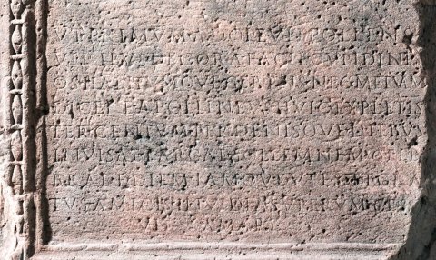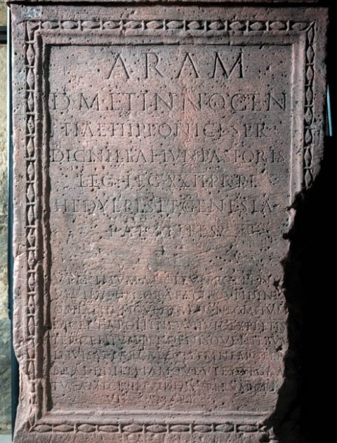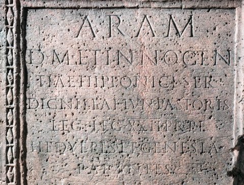 - Aram / d(is) M(anibus) et innocen/tiae Hipponici ser(vi) / Dignillae Iun(i) Pastoris / leg(ati) leg(ionis) XXII Pr(imigeniae) p(iae) f(idelis) / Hedyepes et Genesia / parentes / ut primum adolevit pollens / viribus decora facie Cupidinis / os habitumque gerens nec metuam / dicere Apollineus huic expletis / ter centum ter denisque diebus / invisae Parcae sollemnem cele/brare diem iamque ut esset gra/tus amicis invidia superum cess[a]/vit amari