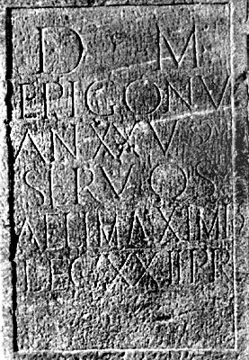 - D(is) M(anibus) / Epigonus / an(norum) XXV / servos(!) / Aeli Maximi |(centurionis) / leg(ionis) XXII Pr(imigeniae)