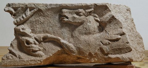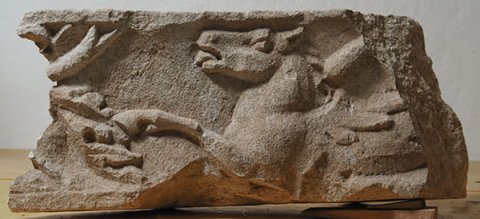 - Meerwesen: geflügelter Hippokamp nach links, vor ihm Reste von Akanthusblättern.