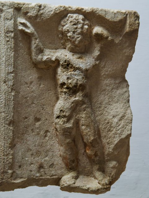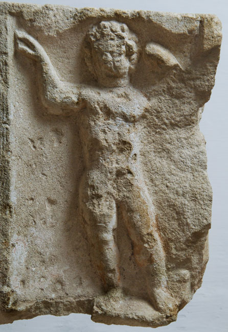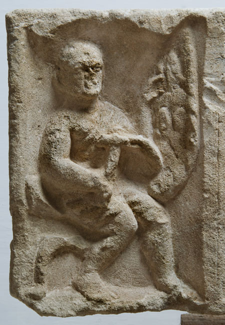 - Mythos: im linken Seitenfeld sitzender Daedalus mit Werkzeug in der Rechten, an einem Flügel arbeitend. Auf der linken Nebenseite Akanthus. Im rechten Seitenfeld stehender nackter Ikarus mit einem Flügel. Auf der rechten Nebenseite Delphin.