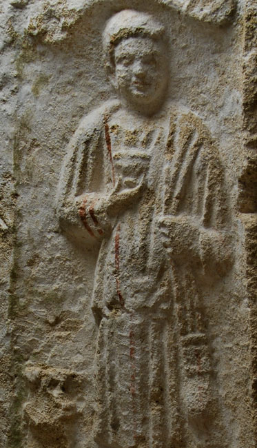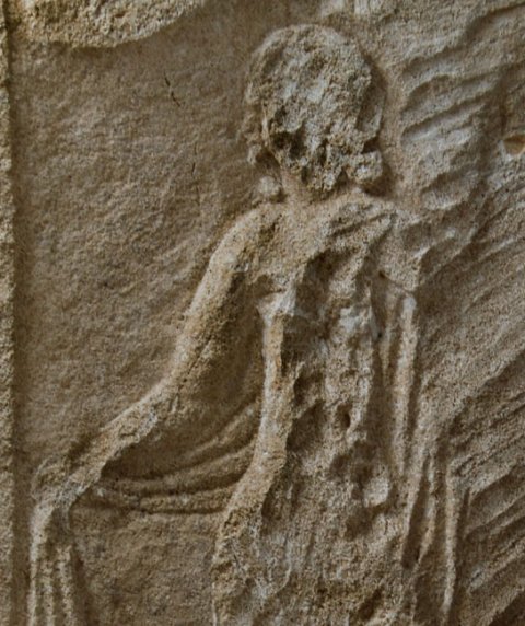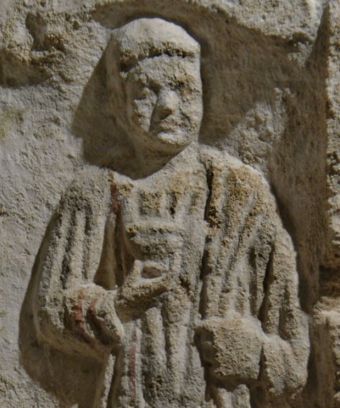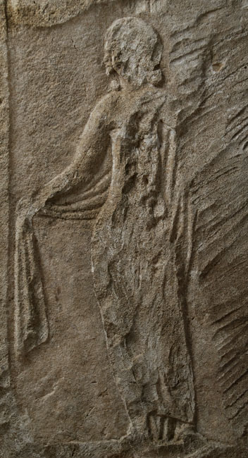 - Rechte Seitenwange. Auf der Außenseite unter Bogen mit Volutenenden frontal stehende Frau in langem Gewand und Mantel, den sie mit der rechten Hand zur Seite zieht (mythische Figur ?). Auf der Innenseite Diener in kurzer Ärmeltunica, in der Rechten Becher, über der linken Schulter mappa. Neben dem rechten Bein Tischchen ?