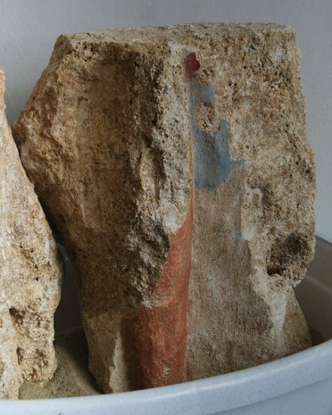 - Innenseite einer rechten Seitenwange mit Diener. Erhalten sind die rot bemalten Unterschenkel einer stehenden Figur in kurzem Gewand. Hintergrund blau. Rechts geglättete Stirnseite.