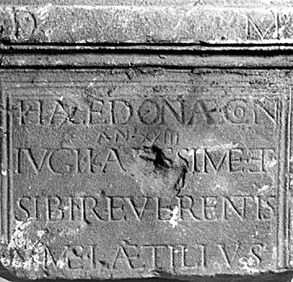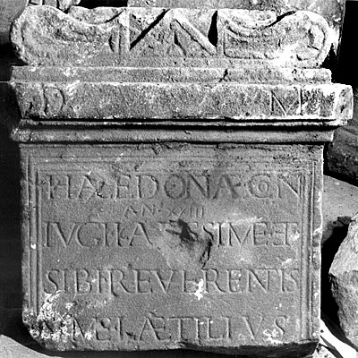 - D(is) M(anibus) // Haledonae / an(norum) XXIII / con/iugi karissim(a)e et / sibi reverentis/sim(a)e L(ucius) Aetilius / [---