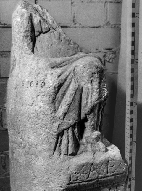 - Mythische Figur: auf altarförmigem Sockel mit Votivinschrift sitzende Fortuna in Chiton und Mantel.