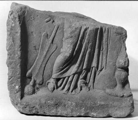 - Mythische Figur: Beine einer stehenden Fortuna in Chiton und Mantel, neben dem rechten Bein Steuerruder, neben dem linken Rest eines balusterförmigen Altars (rechts vermutlich weitere Person).