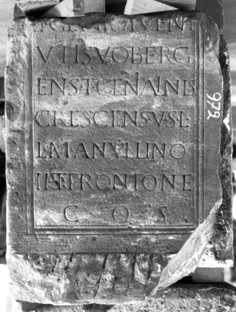 - [-------] / et Genio iu(v)ent/utis Voberg/en(sis) T(itus) Genialinius / Crescens v(otum) s(olvit) l(ibens) / l(aetus) m(erito) Anullino / II et Frontone / co(n)s(ulibus)