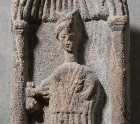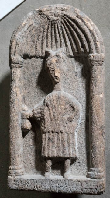 - Mythische Figur. Bogen mit stilisierter Muschelnische auf Halbsäulen. Stehender Mercur mit Flügelkappe, kurzem Gewand, in der Rechten Geldbeutel. Votivinschrift auf der Standleiste.