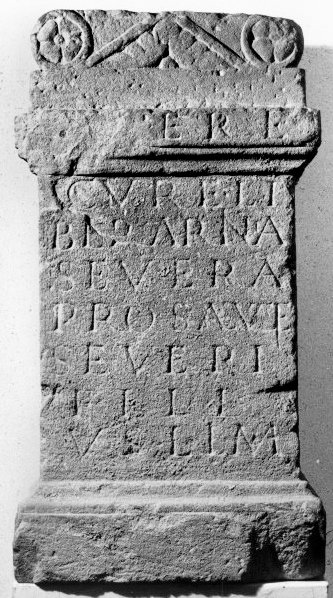 - [Ha]ere/cur(a)e Li/berarinia / Severa / pro salute / Severi / fili(i) / v(otum) s(olvit) l(ibens) l(aeta) m(erito)
