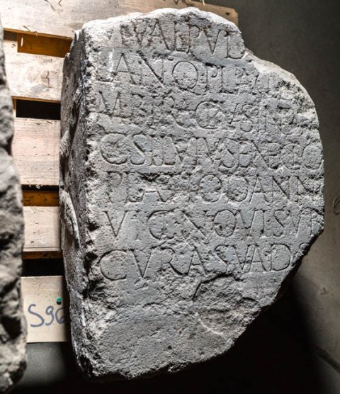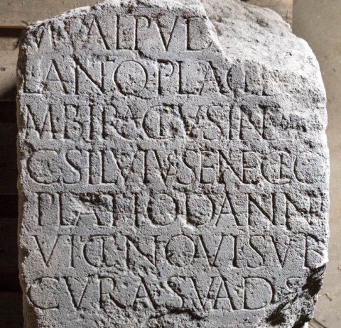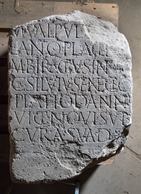 - ---] / M(arcus) Val(erius) Pud[ens] / L(ucius) Anto(nius) Placidu[s] / M(arcus) Biracius Indutiu[s] / C(aius) Silvius Senecio / platiodanni / vici novi sub / cura sua d(e) s(uo)