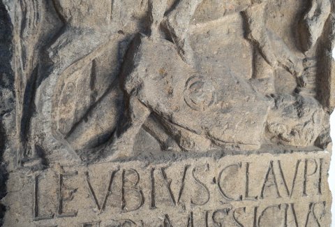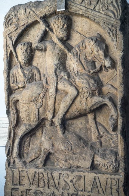 - Leubius Claupi / f(ilius) eq(ues) missicius / ala Sebosiana / an(norum) LXXV h(ic) s(itus) e(st) / Gratus f(ilius) miles / ex t(estamento) f(ecit) // Monumentum