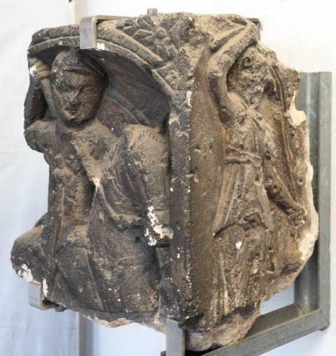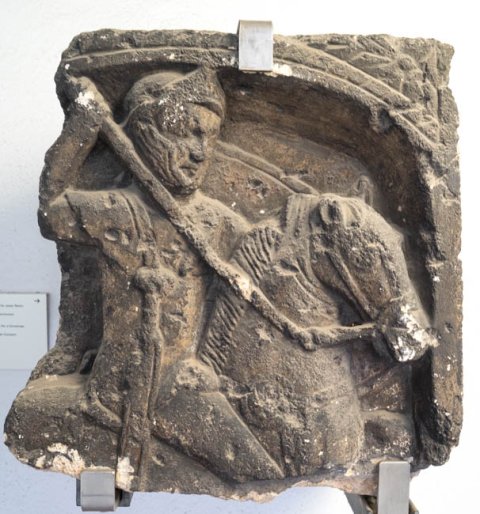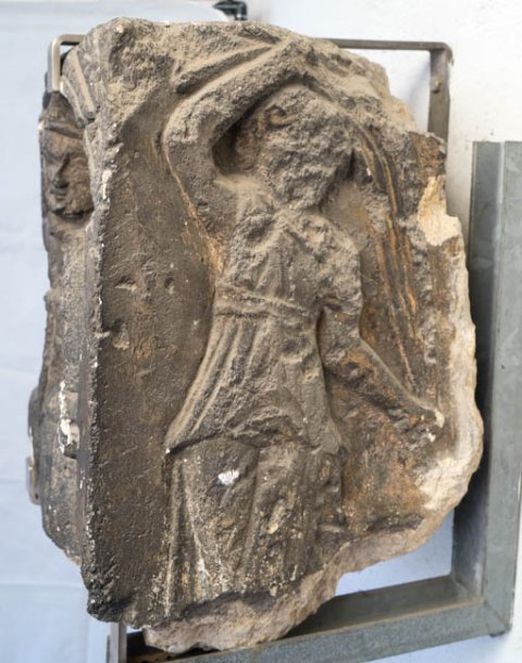 Flacher Bogen, von tordiertem Band gerahmt, in den Eckzwickeln über dem Bogen Akanthusblatt. In der bogennische nach rechts galoppierender Reiter (Soldat). Waffen: Helm, Panzer, Langschwert an der rechten Seite, in der erhobenen Rechten Lanze, in der Linken Schild.
