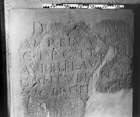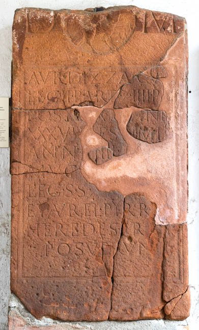 - D(is) M(anibus) // Aur(elius) Dizza c(ustos) a(rmorum) / leg(ionis) II Part(hicae) |(centuria) IIII p[r(incipis?)] / post(erioris) [vi]xi[t] ann(os) / XXXVI [di]es [---]II mi[l(itavit)] / ann(os) [X]IIII [---] / Muc[--- mil(es)] / leg(ionis) s(upra) s(criptae) |(centuria) [---] / et Aurel(ius) Pyrr[us] / heredes frat(ri) / posuerunt