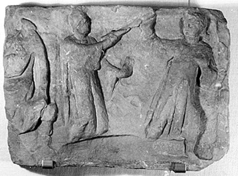 - Kontor-Szene: auf der größeren Platte großer Tisch mit Tintenfass und vier Geldsäcken. Links auf einem Sessel sitzender bärtiger Mann in kurzer Tunica, in den Händen geöffnete Rolle (volumen). Hinter dem Tisch sitzender Mann in Ärmeltunica mit aufgestützem Arm und geöffneter Rolle. Am linken Rand stehender Mann (Diener) in kurzer Tunica, nach links gewandt. Am rechten Rand noch Fuß des Mannes in Tunica und Mantel, der am linken Rand der kleineren Platte nach links hin sitzt. Rechts hinter ihm stehender Mann, der einem davon eilenden Mann eine Rolle reicht.