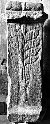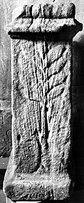 - Volutenpolster (geschnürte pulvini). auf den Nebenseiten je ein Lorbeerbaum.