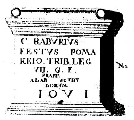 - C(aius) Baburius / Festus Pom(ptina) Ar/retio trib(unus) leg(ionis) / VII G(eminae) F(elicis) / praef(ectus) / alae Scubu/lorum / Iovi