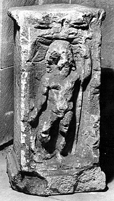 - Mythische Figur: auf der Vorderseite des Altars frontal stehender nackter, bärtiger Neptun, in der erhobenen Linken Dreizack, in der Rechten Delphin, rechter Fuß auf Felsen gestellt, hinter dem Kopf eingeritzte Muschelnische, Neben- und Rückseite geglättet.