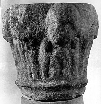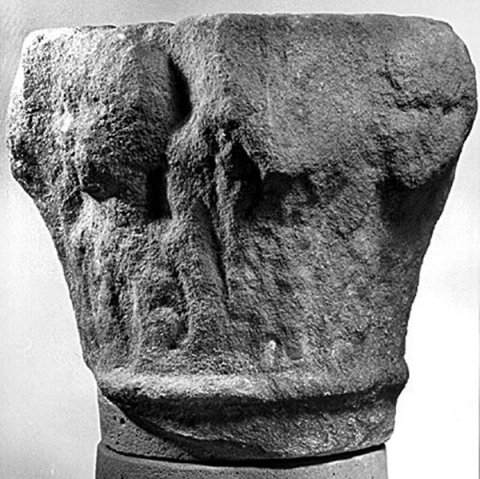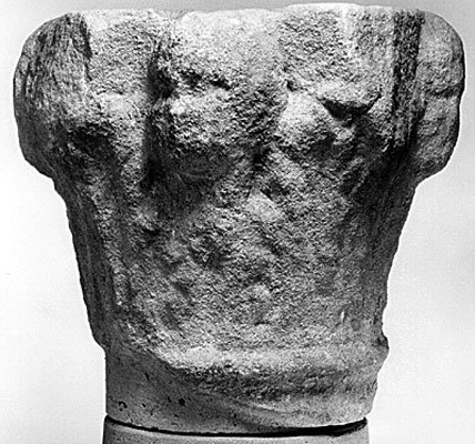 - Kapitell mit Blattkranz, aus dem vier Köpfe ragen
