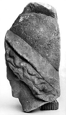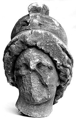 - Mythische Figur (Minerva ?): Kopf mit zurückgeschobenem Helm, unter dem gelocktes, in der Mitte gescheiteltes Haar hervorquillt. Wegen der Mars Loucetius-Inschrift vom selben Fundort auch als Teil einer Mars Loucetius Statue gedeutet.