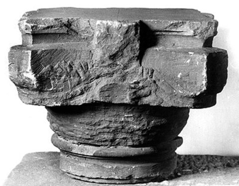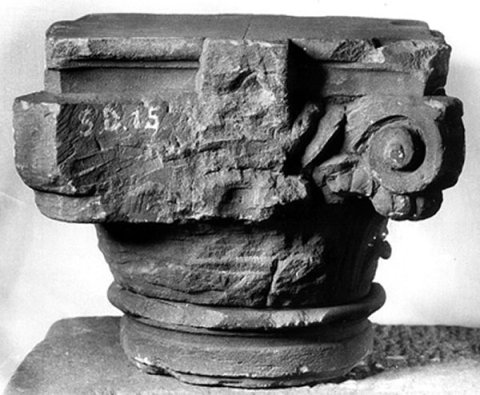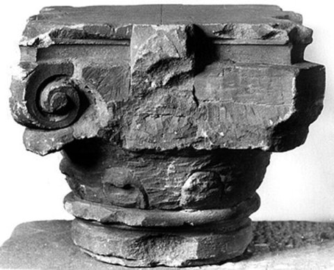 - Kapitell mit Akanthusblattkranz und Voluten, über dem mittleren Blatt drei Mohnkapseln.