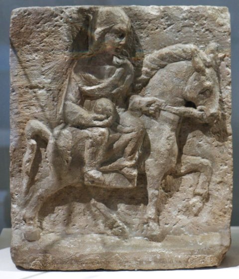 - Mythische Figur: auf einem nach rechts gehenden Pferd im Damensitz reitende Epona, Mantel um beide Schultern, die Linke fasst den Zügel, in der Rechten Frucht. Rahmenlose Platte mit Standleiste.