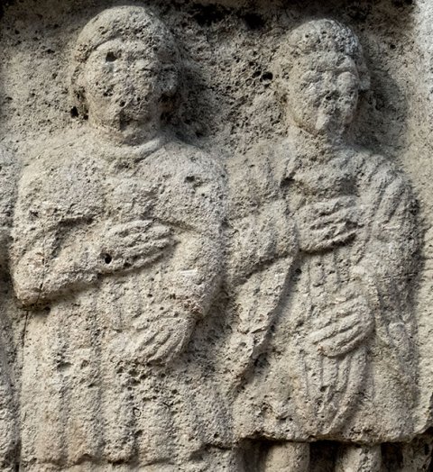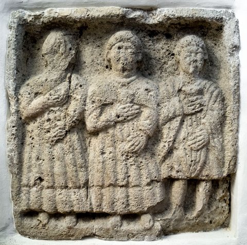 - Familie: in Rechtecknische drei frontal stehende Ganzfiguren. Links und in der Mitte einheimische Frau mit Umhang, die linke mit Frucht (Vogel ?) in der rechten Hand, die mittlere mit Torques (?). Rechts Mann in kurzem Gewand und Mantel, in der Rechten Becher.