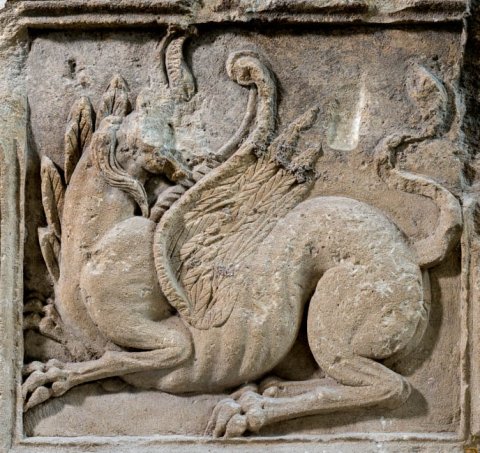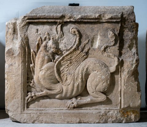 - Gerahmtes Bildfeld mit nach links hin liegendem Greif, der den Kopf zurück wendet. Von der Principia des Legionslagers ?