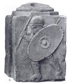 - Auf der Vorderseite des kubischen Sockels Ganzfigur eines nach links hin angreifenden Soldaten mit Stiefeln (caligae). Waffen: Helm, in der Linken Schild (scutum) und zwei Speere, Lanze in der erhobenen Rechten. Von der Principia des Legionslagers ?