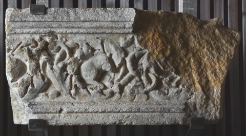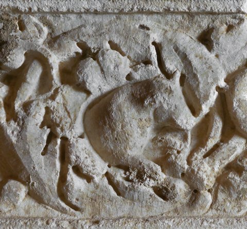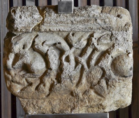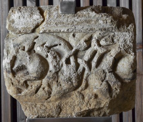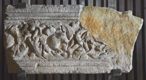 - Auf der Vorderseite Fries aus Akanthusranken mit Tierprotomen, auf der Unterseite Reste von Ranken (?).