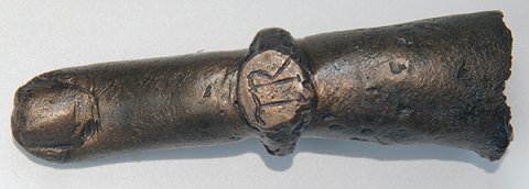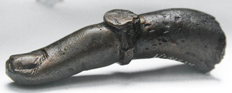 - Finger der linken Hand einer etwa lebensgroßen Figur mit Ring, auf der Ringplatte TR eingraviert.