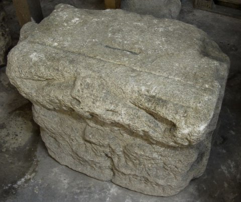- stark verwittert, oben an den Seitenkanten Klammernlöcher, beim rechten Kapitell in der Oberseite Hebeloch