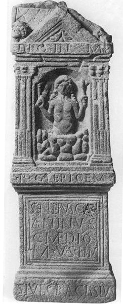 - Mythos, mythische Figuren: Altarförmiger Sockel mit Inschriften auf drei Seiten. Darüber Aedicula mit Bogennischen zwischen kannelierten Pilastern an den vier Ecken. Dach mit vier Giebeln, in den Giebelfeldern Blatt oder Rosette. Vorderseite: Felsgeburt des Mithras, der Fackel und Messer hält. Linke Nebenseite: oben Cautes, auf dem Sockel Adler mit Blitzbündel auf einem Globus mit Sternen. Rechte Nebenseite: oben Cautopates, auf dem Sockel auf dem Wassergefäß gelagerter Oceanus mit Anker in der Rechten.