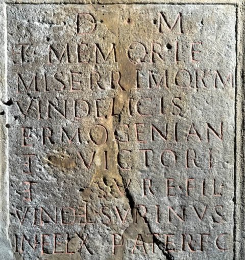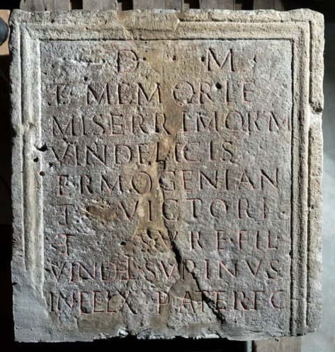- D(is) M(anibus) / et memori(a)e / miserrimorum / Vindelici(i)s / Ermogeniano / et V[i]ctori / et Sur(a)e fil(iis) / Vindel(icius) Surinus / infelix pater f(aciendum) c(uravit)