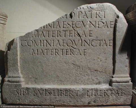 - [C(aius) I]ulius C(ai) f(ilius) Vel(ina) Ma[---] // [m]il(es) c(o)hor(tis) V[--- praet(oriae)] / C(aio) Iulio M[---] / Cominia[e ---] / mat[ri] / [---]iro / [---]nio patri / [Co]miniae Secundae / materterae / Cominiae Quinctae / materterae // sibi suis libert(is) libertab(usque)
