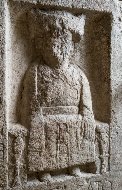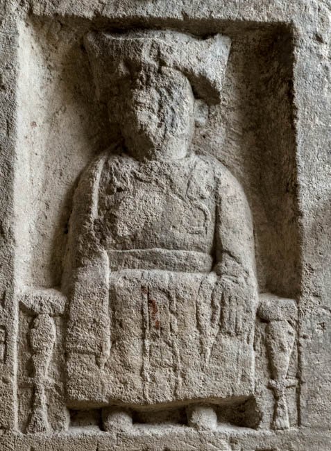 - Einheimische Frau: in Rechtecknische Bank mit gedrechselten Beinen, sitzende Ganzfigur: Pelzhut, Ärmelgewand mit breitem Gürtel, Umhang, Fibeln mit Ring, Halsreif, unter der linken Hand Spindel.