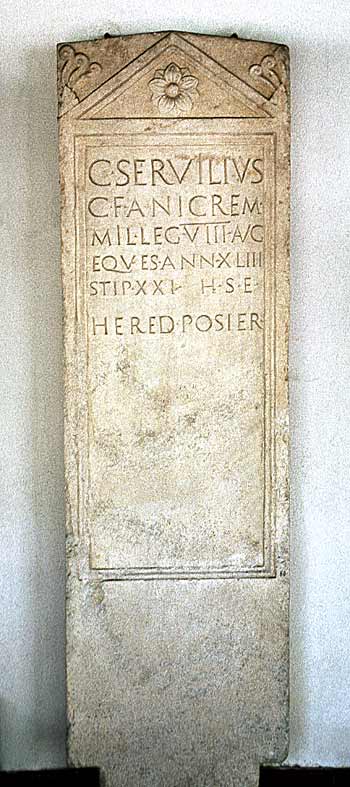 - C(aius) Servilius / C(aii) f(ilius) Ani(ensis) Crem(ona) / mil(es) leg(ionis) VIII Aug(ustae) / eques ann(orum) XLIII / stip(endiorum) XXI h(ic) s(itus) e(st) / hered(es) posier(unt) (!)
