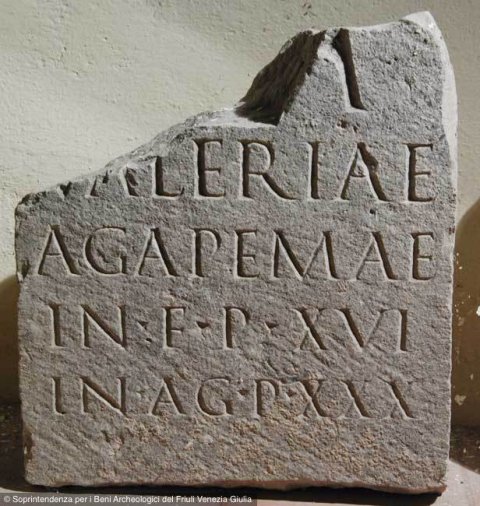 - [L(ocus)] m(onumenti) / Valeriae / Agapemae / in f(ronte) p(edes) XVI / in ag(ro) p(edes) XXX