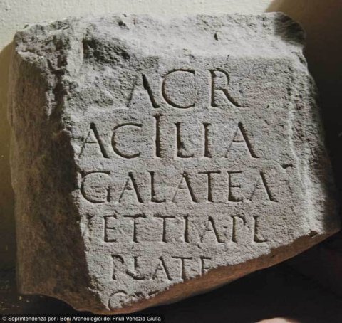 - ---] / sacr(um) / Acilia / Galatea / Vettia P(ubli) l(iberta) / Plate / Cist[---] / [---?