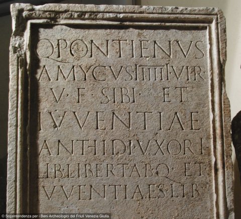 - Q(uintus) Pontienus / Amycus IIIIIIvir / v(ivus) f(ecit) sibi et / Iuventiae / Anthidi uxori / lib(ertis) libertab(us)q(ue) et / Iuventiaes lib(ertis) // l(ocus) m(onumenti) in f(ronte) p(edes) X[--- in a(gro)] p(edes) XXXII