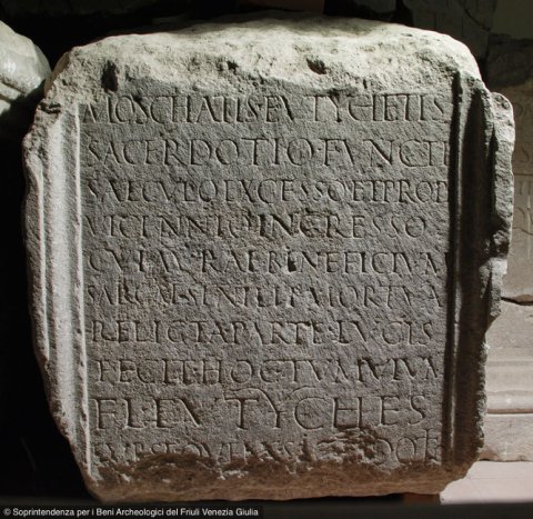 - Moschatis Eutychetis / sacerdotio functi / saeculo excesso et prope / vicennio ingresso / cui aurae beneficium / sarcae senili emortua / relicta parte lucis / fecit hoc(!) tumulum / Fl(avius) Eutyches / supsequens(!) sac[er]dotio