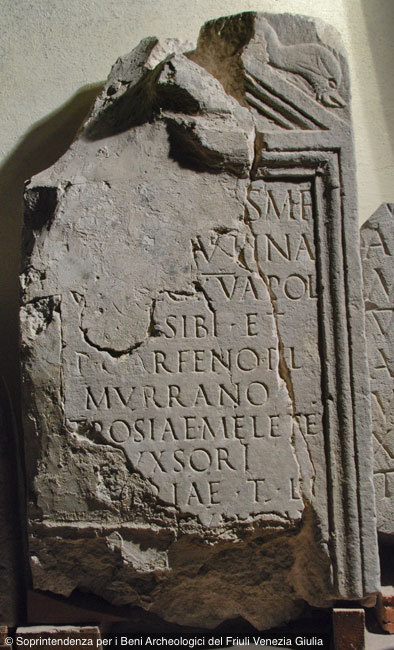 - [P(ublius) Carfenu]s M(arci) f(ilius) / [Pol(lia) M]utina / v[et(eranus) l]eg(ionis) XV Apol(linaris) / [v(ivus) f(ecit)] sibi et / P(ublio) Carfeno P(ubli) l(iberto) / Murrano / Trosiae Melete / ux{s}ori / [---]riae T(iti) l(ibertae) / [---]unatae(?) // l(ocus) m(onumenti) in fr(onte) p(edes) X / in agr(o) p(edes) XVIII