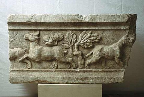 - Tiere: nach links laufende Hirsche, nach rechts Hund, dazwischen Baum.