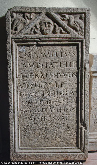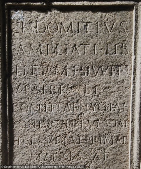 - Cn(aeus) Domitius / Ampliati lib(ertus) / Hermes iuven(is) / v(ivus) f(ecit) sibi et / Domitiae Hygiae / coniugi defunctae / et Claudiae Primae / matri suae