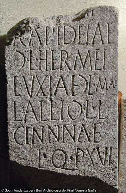 - ---]ai / Rapideiae / |(mulieris) l(ibertae) Hermei / Luxiae |(mulieris) l(ibertae) Mae / L(ucio) Allio L(uci) l(iberto) / Cinnae / l(ocus) q(uadratus) p(edum) XVI