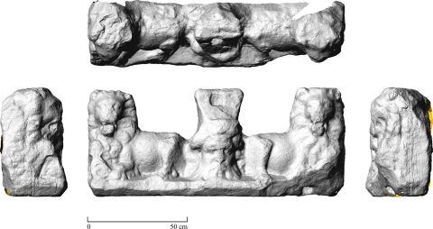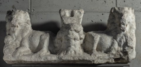 - Bärtiger Kopf mit Polos zwischen liegenden Löwen mit Widderkopf in den Pranken.