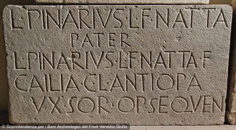 - L(ucius) Pinarius L(uci) f(ilius) Natta / pater / L(ucius) Pinarius L(uci) f(ilius) Natta f(ilius) / Cailia C(ai) l(iberta) Antiopa / ux{s}or opsequen(tissima)(!)