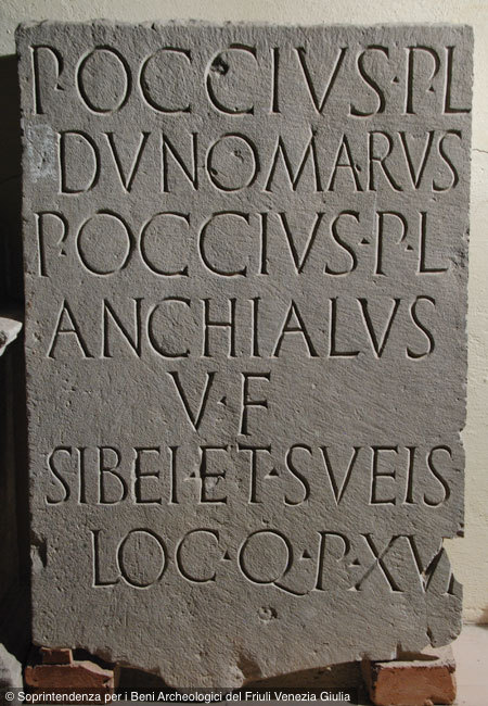 - P(ublius) Occius P(ubli) l(ibertus) / Dunomarus / P(ublius) Occius P(ubli) l(ibertus) / Anchialus / v(ivi) f(ecerunt) / sibei(!) et sueis(!) / loc(us) q(uadratus) p(edum) XVI